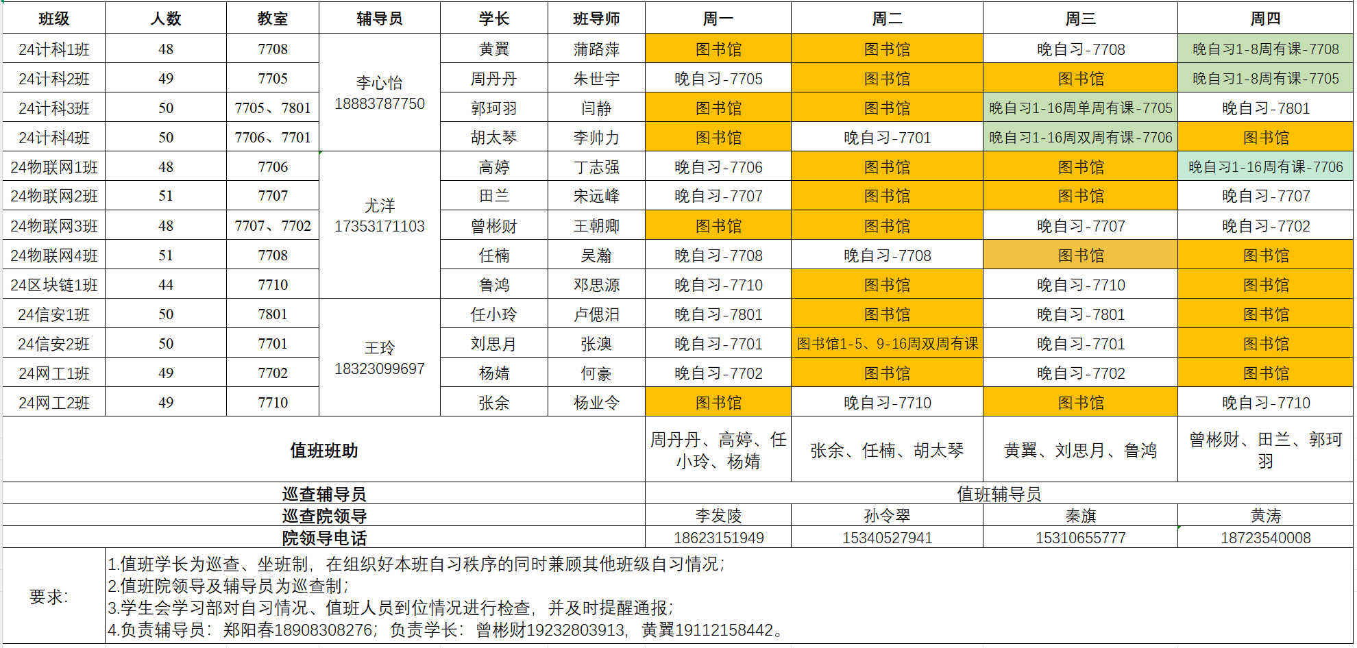 计算机与物联网学院晚自习安排一览表(2025-2026学年第二学期)
