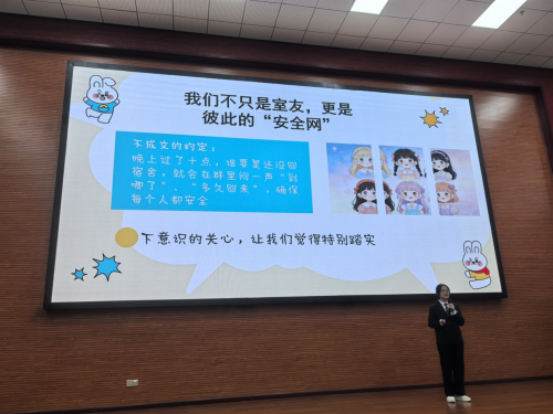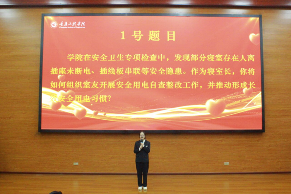 在“寝室文化建设”环节展示中,6位寝室长化身“家园代言人”,全方位呈现了各具特色的寝室文化;案例分析环节则聚焦寝室长的实际工作能力,采用“现场抽题+限时思考+即时作答”的形式,考验选手的问题分析、逻辑思维与应急处置能力。题目涵盖寝室常见的作息冲突、学习氛围营造、同学矛盾调解、安全隐患排查等多个场景,贴近大学生寝室生活实际;评委提问环节中,围绕学校校训、校风、学风建设,结合“红岩精神”的时代内涵与计算机专业特色,抛出“如何将红岩奋斗精神融入寝室学习生活”“怎样结合专业特点带动寝室学风” 等针对性问题,选手们从容应答,展现了对育人理念与红色文化的深刻领悟。