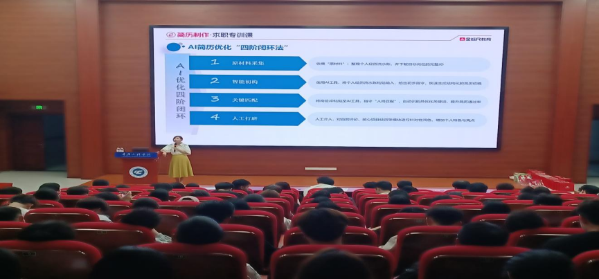 讲座中,杨雪结合自身丰富的人事管理经验,围绕简历诊断、简历制作五大核心要素、简历投递渠道及注意事项、AI简历优化“四阶闭环法”四大核心内容展开详细讲解。她针对专升本学生的求职特点,拆解简历制作误区,分享关键词优化、成果量化等实用技巧,演示AI工具在简历优化各环节的应用方法,同时提醒学生规避投递中的常见问题,提升简历命中率。