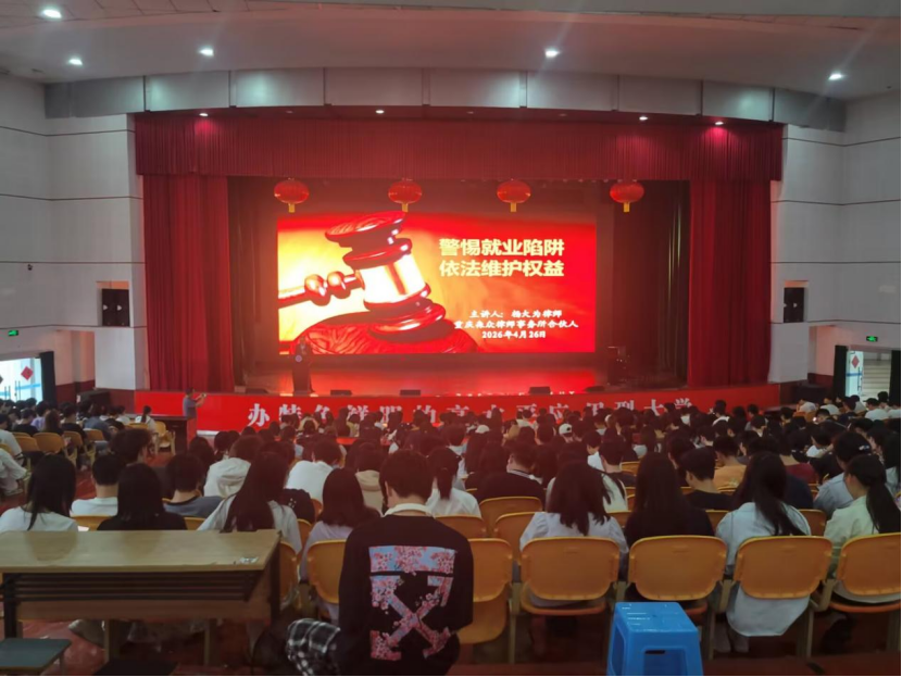 本网讯(文/图 魏克非)2026年4月26日17时,我院特邀重庆森众律师事务所合伙人杨大为律师,在学术报告厅开展以 “警惕就业陷阱 依法维护权益” 为主题的就业指导专题讲座,600余名2023 级全体学生到场参加,讲座内容详实、案例鲜活、实用性强,现场学习氛围浓厚。
