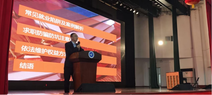 本次讲座中,他结合大学生求职特点与真实法律案例,围绕常见就业陷阱、求职防骗注意事项、依法维权方法三大板块展开全面讲解。讲座重点剖析了央(国)企付费内推、高薪诱饵、入职收费、招聘转培训、传销、违法犯罪用工等七大类高频求职陷阱,用央企内推诈骗、高薪主播骗局、招聘转培训贷、电商代运营诈骗等真实案例,直观揭示各类陷阱的套路与危害,并给出清晰识别技巧,提醒同学们警惕 “付费包入职”“高薪低门槛”“零基础包就业” 等虚假承诺。