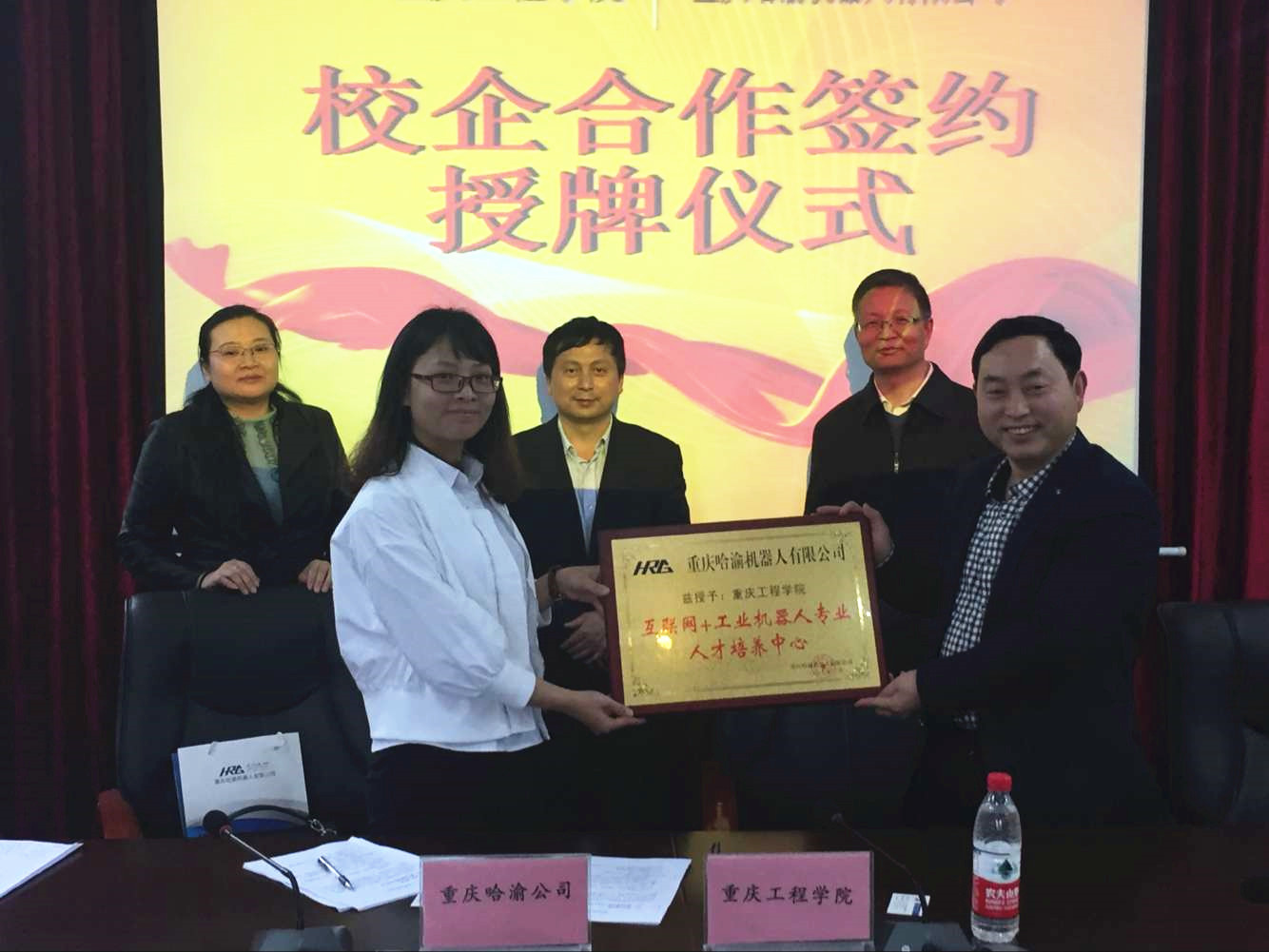 本网讯(校企合作办 毛云莹)3月29日下午,我校与重庆哈渝机器人有限公司在行政楼第二会议室举行校企合作签约暨授牌仪式,永川工业园区凤凰湖管委会科长赵昌全、哈渝公司副总经理贾万玲、我校党委书记兼常务副校长张业平、智能与自动化学院院长曹耀钦、校企合作办主任秦凤梅出席了签约仪式。