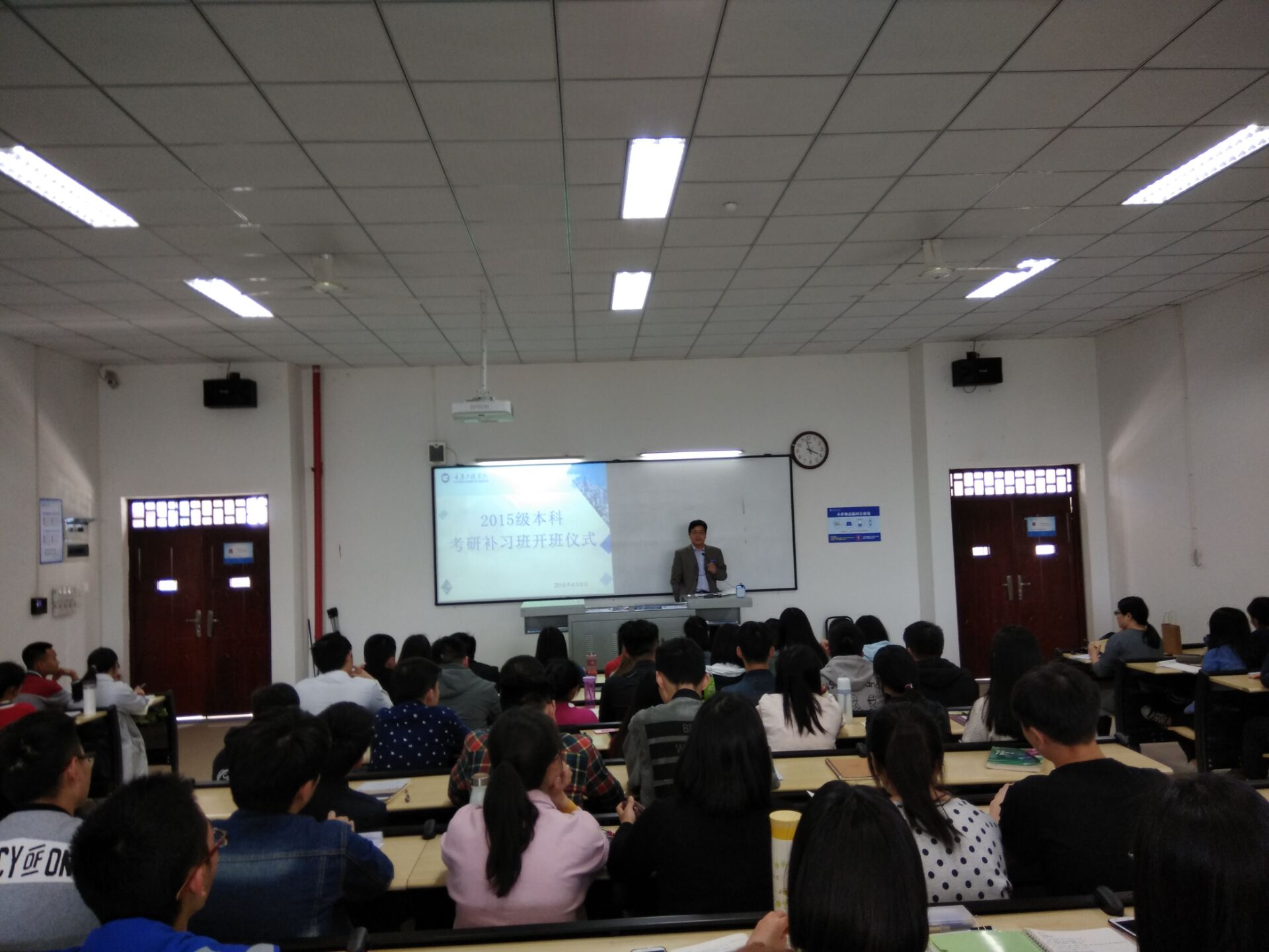 学校副校长程昌华教授,在开班仪式宣读学校《关于加强本科生考研工作的实施意见》、《考研班学生学分置换办法》等文件,对助考班学生分类管理、奖励政策、学习环境、学习小组等内容进行重点解读,勉励同学们做好规划,找对方法,持之以恒,坚持到底,争取最优成绩。考研班班主任、英语教师宋曼就课程安排、日常管理等问题,与学员进行交流。
