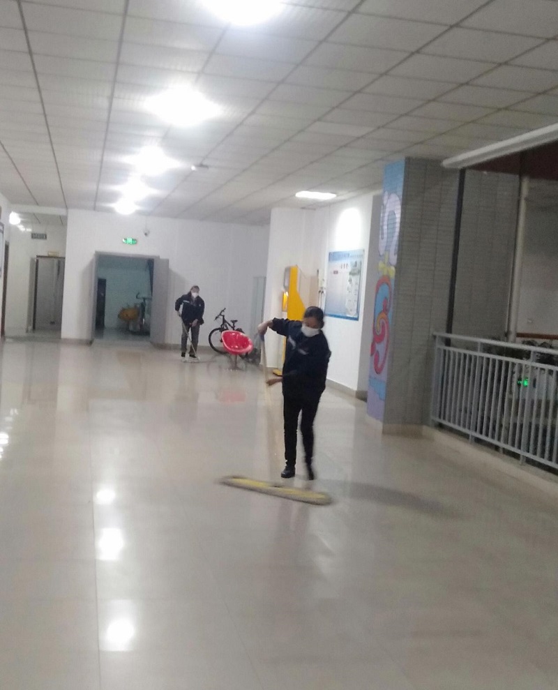 我们是不是会有这样的感受,明明没有经常看见保洁人员,但是宿舍过道、教学楼的楼道、校园的街道总是干干净净的。那是因为当我们还在呼呼大睡时,保洁工作人员就早已到岗。一般情况下,早上5点,叔叔阿姨们就已经开始清扫街道的落叶和垃圾,负责教学楼的阿姨也开始扫地和拖地,线下课时因为同学们有早课,为了不打扰大家的学习,总是早早的就清洁好,等着同学们上课;现在虽然是线上课,但有些在准备考试的同学也会很早去教室复习,阿姨们便还是坚持每天五点到岗。