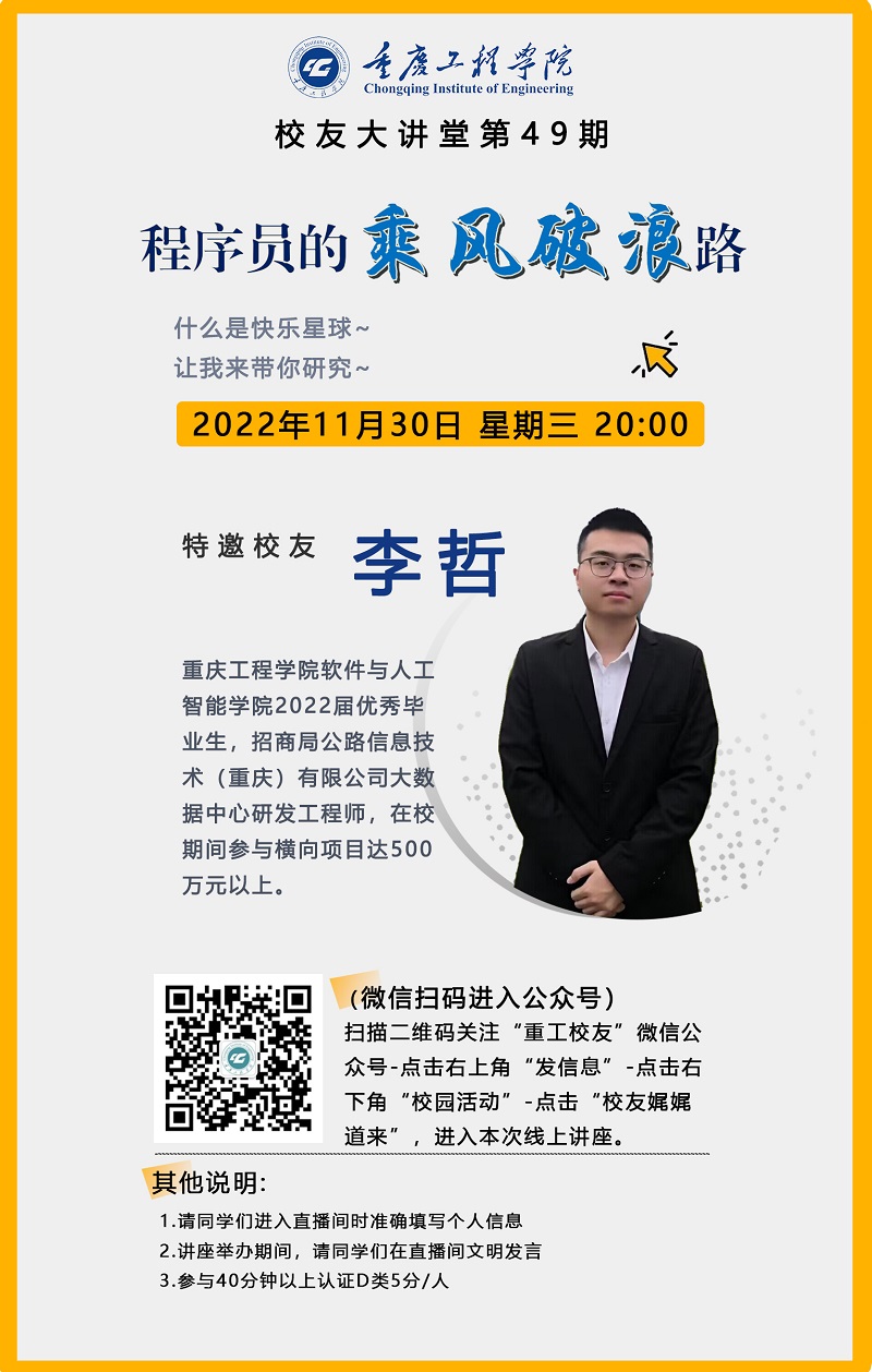 本网讯(文/图 招就处 叶秋清)为了充分发挥优秀校友的榜样力量,鼓励重工学子勇敢追逐自己的职业梦想,学校校友工作办公室于11月30日举办了第49期“校友大讲堂”,本次活动邀请了优秀校友李哲学长做“程序员的乘风破浪路”主题分享,全校4000多名同学通过鹅直播参与了线上讲座。