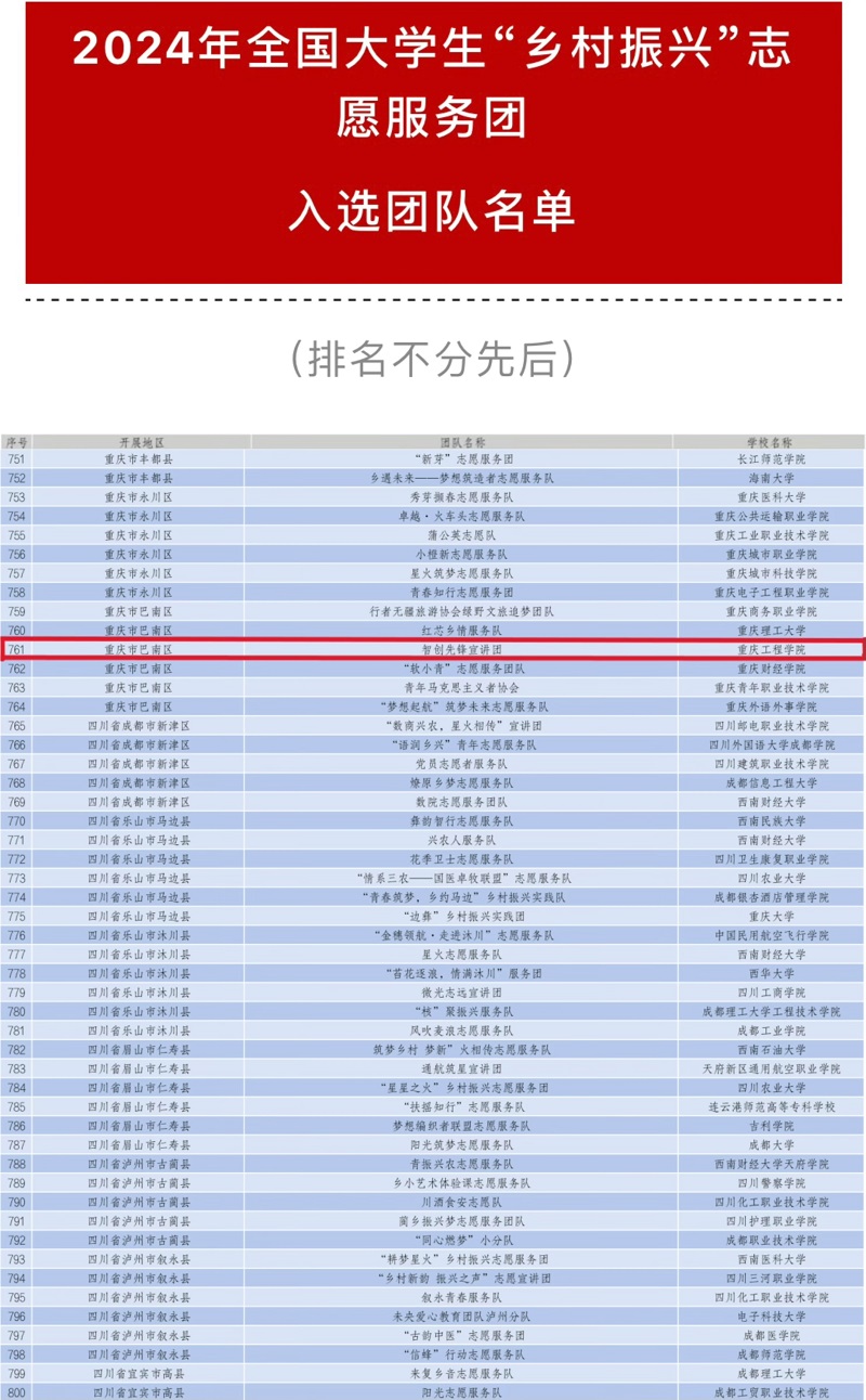 本网讯(文/图 智能制造学院 荣菁菁)5月28日,2024年全国大学生“乡村振兴”志愿服务团入选团队名单公布,重庆工程学院智创先锋宣讲团成功入选。