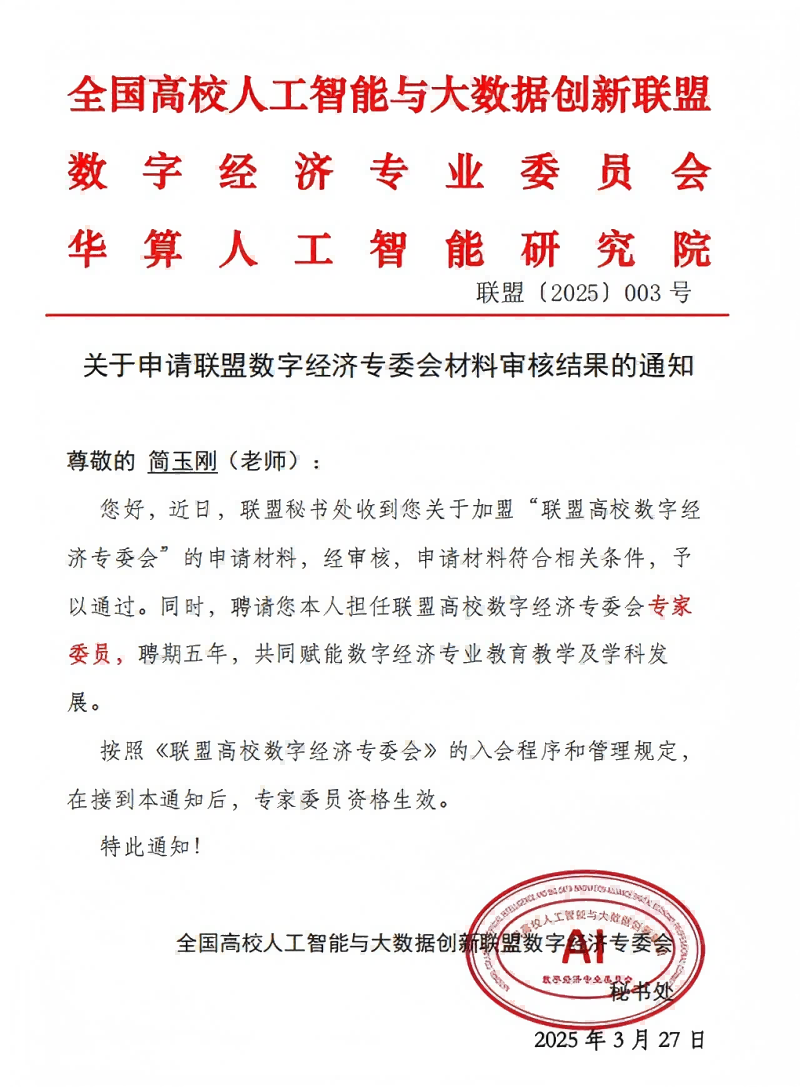 本网讯(文/图 管理学院 朱露)近日,全国高校人工智能与大数据创新联盟数字经济专委会公布了联盟数字经济专委会评审结果,校长助理、管理学院院长简玉刚受聘联盟数字经济专委会专家委员,聘期五年。