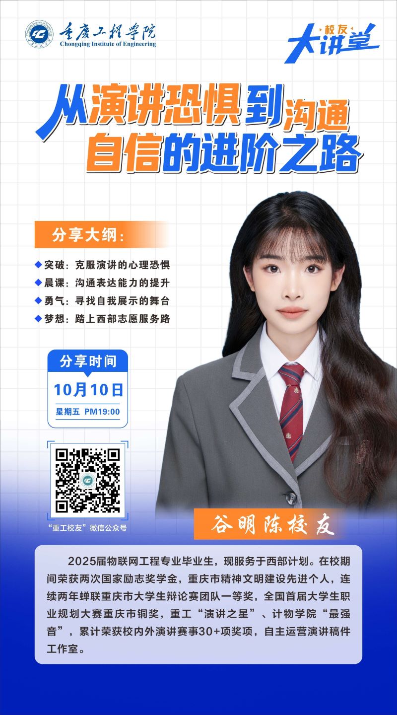 本网讯(文/图 就业指导中心 叶秋清)10月10日晚,由学校就业指导中心主办的“校友大讲堂”通过鹅直播平台举行。2025届物联网工程专业优秀校友、现西部计划志愿者谷明陈应邀作“从演讲恐惧到沟通自信的进阶之路”的主题分享,吸引近6000人次学生在线参与。