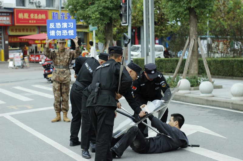 演练设定在学校大门,一名“持械暴徒”强闯校门,意图袭击师生。学校安保人员发现后立即启动“一键报警”系统,同时手持防暴盾牌、钢叉等器械与“暴徒”周旋,防止其进入校园。同时立即发出警报,组织附近师生有序疏散到安全区域,紧锁门窗,防止“暴恐分子”闯入教学楼及宿舍区域,随后各应急小组迅速到场,按照应急预案,运用专业战术配合,成功将“暴恐分子”制服抓获,并等待民警的到来。