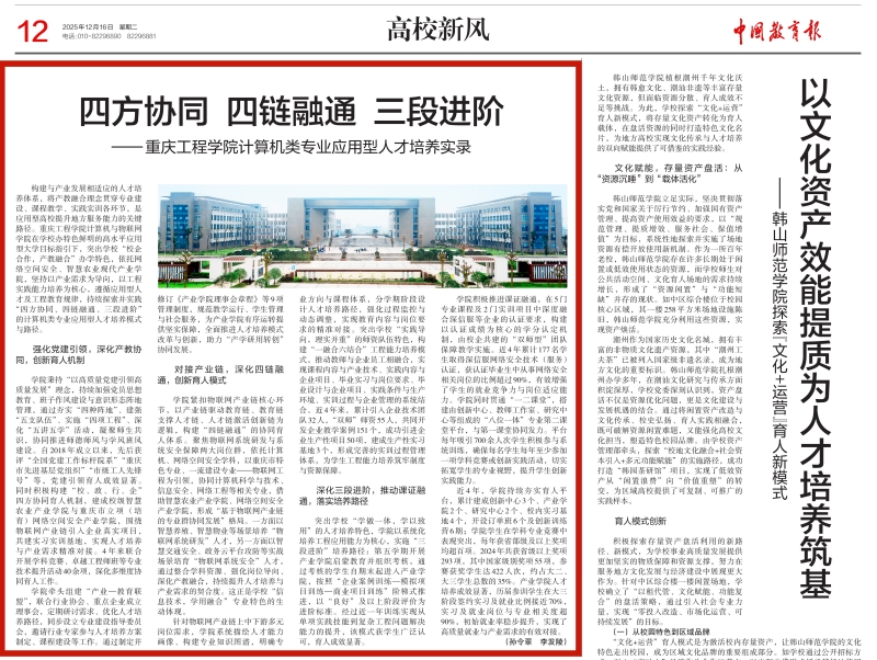 本网讯(文/图 党委宣传部)12月16日,国家级权威教育媒体《中国教育报》专题刊发我校计算机与物联网学院人才培养成果报道——《四方协同 四链融通 三段进阶——重庆工程学院计算机类专业应用型人才培养实录》,系统展现了学校在应用型人才培养领域的创新实践与显著成效,为应用型高校服务区域产业发展提供了可借鉴的“重工方案”。