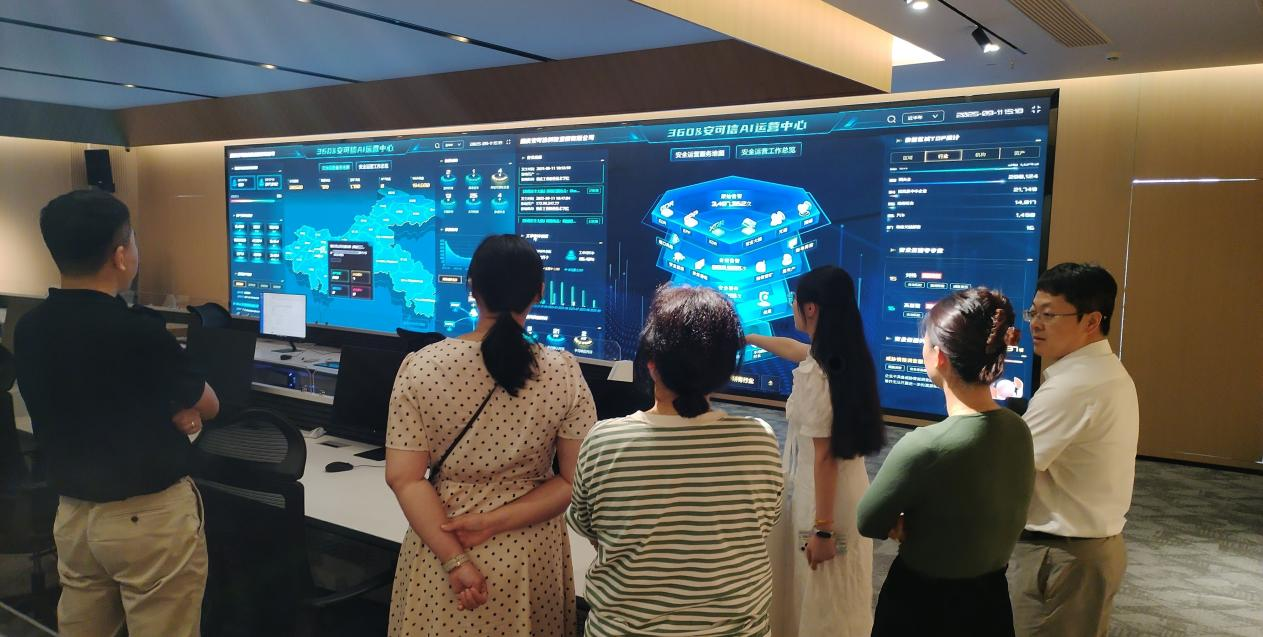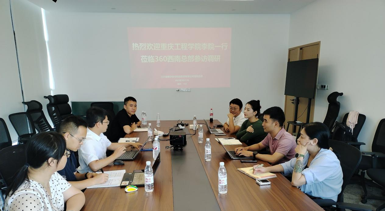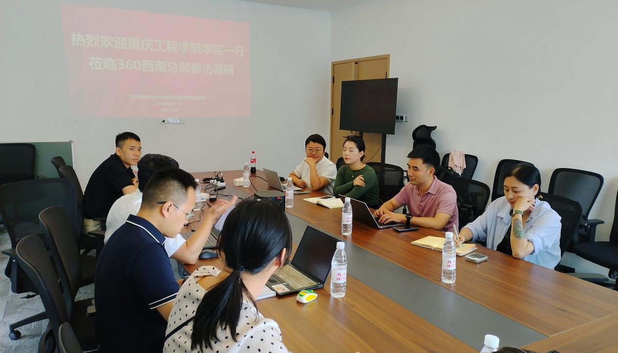 本网讯(文/图 大数据与人工智能学院 敬夫)9月11日下午,大数据与人工智能学院院长李钦、副院长吴平、人工智能系主任陈怡然、就业科敬夫、专任老师林嘉诚一行前往360科技集团西南总部调研。360ISC.Ai学院副院长秦江艳、川渝藏大区负责人陈华荣、集团销售经理张晶晶、360产业链合作企业安可信负责人沈致柯等参加了交流座谈。