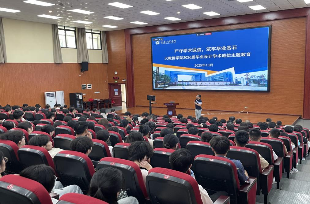 本网讯(图/文 大数据与人工智能学院 傅沙沙)为落实《重庆工程学院关于做好2026届本科毕业设计(论文)工作的通知》(教函〔2025〕127号)精神,弘扬科学精神,强化学术诚信意识,夯实毕业设计质量根基,10月10日下午14:00时,大数据与人工智能学院在南泉校区7807报告厅召开2026届毕业设计(论文)学术诚信主题教育讲座。学院教学副院长廖宁、教务科、2026届毕业设计指导教师及2026届毕业学生共计400余人线上线下同步参会,会议由廖宁副院长主持。