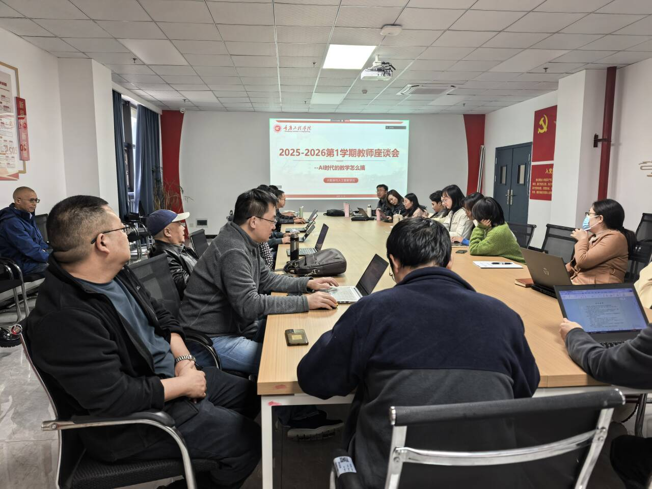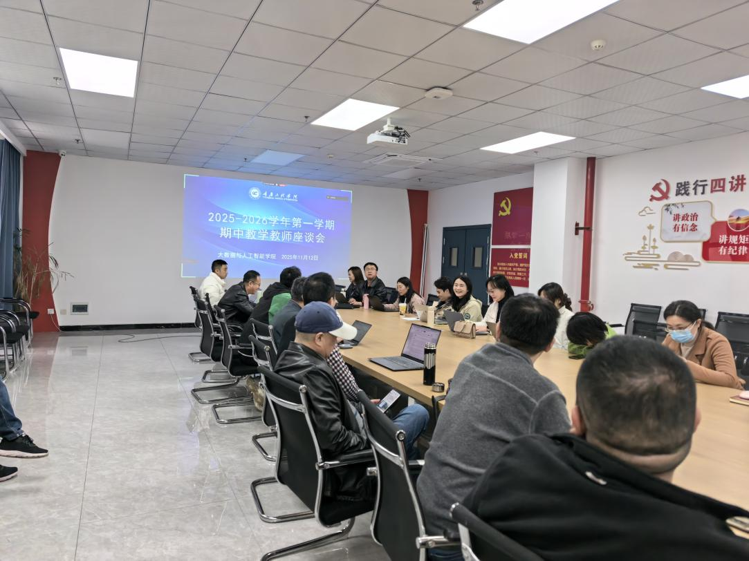 本网讯(文/图 大数据与人工智能学院 傅沙沙)11月12日,大数据与人工智能学院在南泉校区7205组织召开2025-2026学年第一学期期中教学教师座谈会。会议由教学副院长廖宁主持,学院领导、教务科、各系部负责人、全体教师等30余人参会。会议以“AI时代的教学怎么搞”为主题,围绕AI课程建设、教学实施中的问题与对策展开深入交流,旨在推动AI技术与教育教学的深度融合,提升教学质量与学生学习成效。