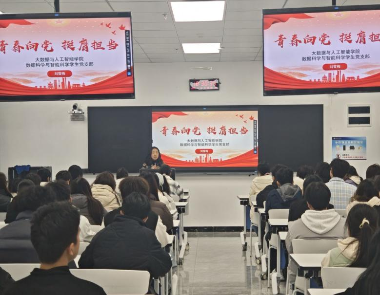 本网讯(文/图 大数据与人工智能学院 胡漫)为加强入党积极分子的培养教育,提升思想政治素养,规范党员发展流程,大数据与人工智能学院数据科学与智能科学学生党支部于11月19日晚在71206组织开展“青春向党 挺膺担当”主题党课。本次党课由支部书记刘雪梅主讲,2024级全体入党积极分子参与。