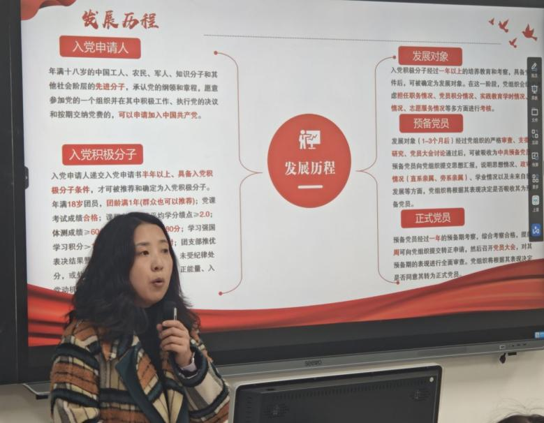 刘雪梅围绕党员发展流程与青年使命担当,系统讲解了从申请入党到成为正式党员的全过程,包括推优程序、学业成绩、实践学时、志愿服务等关键指标。她结合学院实际,强调要端正入党动机、筑牢理想信念的重要性。