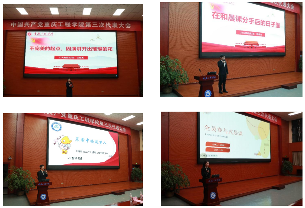 在交流分享环节,“演讲之星”代表汪锶晨、鲜惠山分别以《不完美的起点,因演讲开出璀璨的花》、《在和晨课分手后的日子里》为题,分享了他们在演讲道路上的成长与感悟;“优秀晨课助教”代表杨棋、邱莘苹则围绕《晨雾中的筑梦人》、《全员参与式晨课》主题,讲述了他们在晨课组织、班级协作中的实践与收获。四位同学的分享既有个人成长的深刻反思,也有组织管理的宝贵经验。