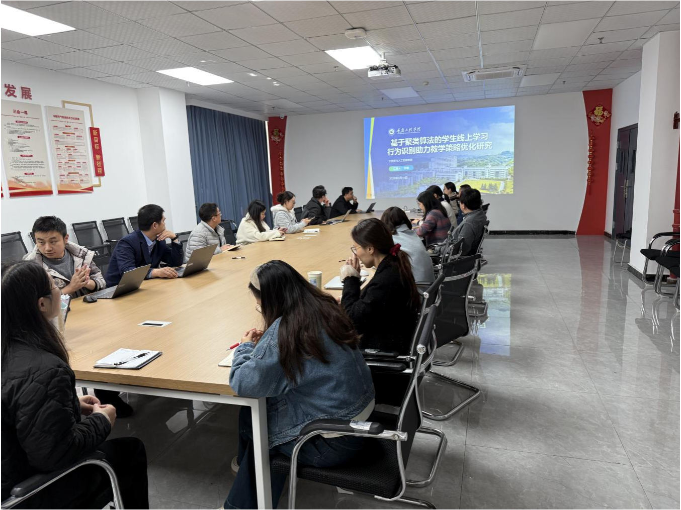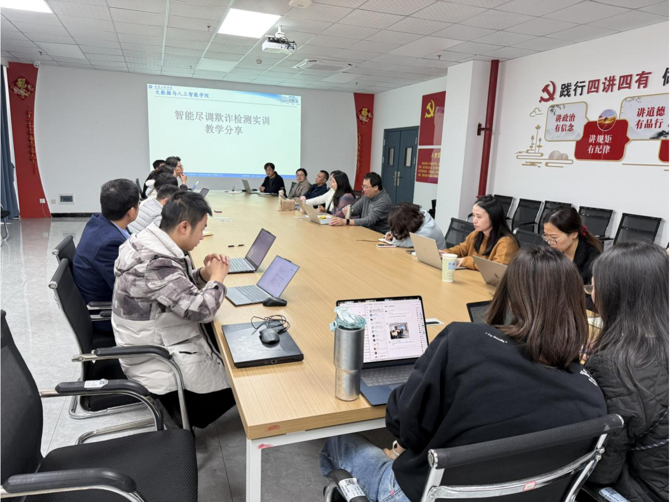 活动中,李敏老师汇报了教研课题《基于聚类算法的学生线上学习行为识别助力教学策略优化探究》相关成果及研究心得。该项目通过聚类算法挖掘学生线上学习行为特征,力求通过交叉学科研究优化课堂教学策略,已取得初步进展。汪进老师则围绕产教融合课程《智能尽调欺诈检测实训》,从课程项目库建设、实训模块设计、教学痛点等方面进行了教学分享。