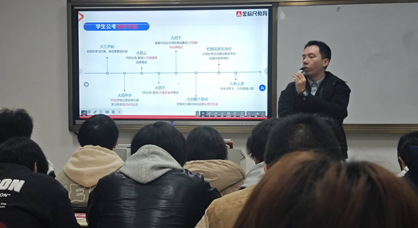 讲座紧扣学生实际需求,内容系统全面。主讲嘉宾金标尺考公邓坐州老师首先结合大数据与人工智能专业特色,细致分析了公务员体系中适合本专业学子的技术类、科研类岗位及发展路径,并对比了体制内外职业特点,助力同学们明确方向。随后,通过实际案例深入讲解了科学选岗的方法与常见误区,提供了切实可行的选岗策略。针对国考、省考、选调生等不同考试,嘉宾详细解读了其核心差异与备考侧重点。最后,为不同年级学生量身定制了阶段性备考时间规划与复习建议。