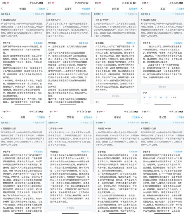 随后,刘雪梅同志结合《习近平对全面依法治国工作作出重要指示》等材料进行政治理论领学,并贯通习近平总书记2025年11月关于全面依法治国、网络生态治理、广东考察及贯彻党的二十届四中全会精神系列重要讲话精神,重点阐释“十一个坚持”的核心要义。她联系数据安全与算法伦理的专业背景,引导党员思考将法治要求具体落实到专业学习各环节,激励大家在技术创新中坚守法治底线。会后,同学们围绕“如何结合系列讲话精神与专业学习谈体会”的问题,在学习通分享个人感悟,累计发布学习心得32条。