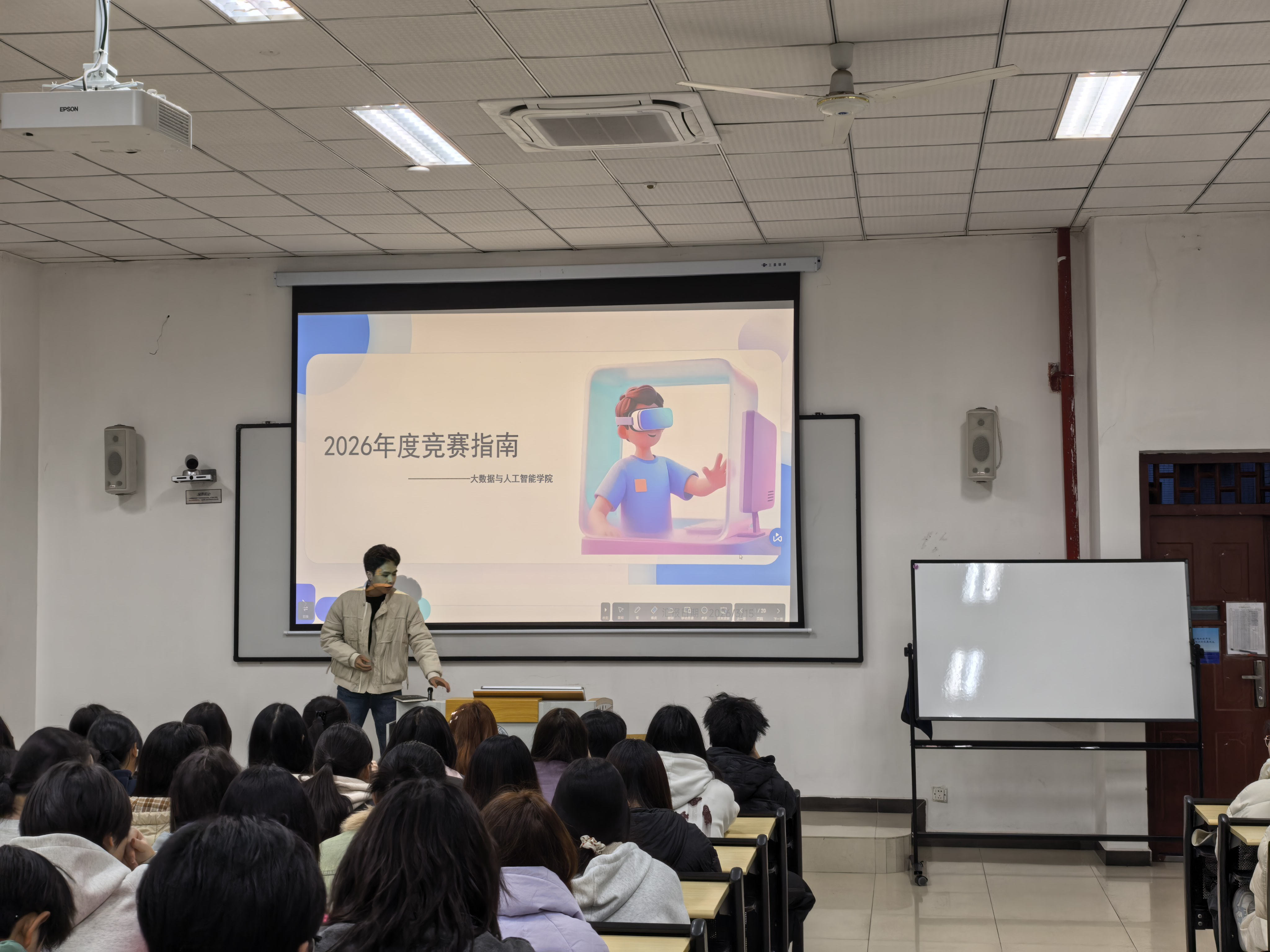 本网讯(文/图 大数据与人工智能学院 陆万里)3月15日19:00,大数据与人工智能学院24级数据科学与大数据技术专业全体同学,联合辅导员杨斯琪组织的周末班会,开展2026年学科竞赛指导。学院竞赛管理人陆万里老师为数据科学与大数据技术专业大二年级同学们系统讲解竞赛相关知识,明晰参赛方向,点燃竞赛热情。