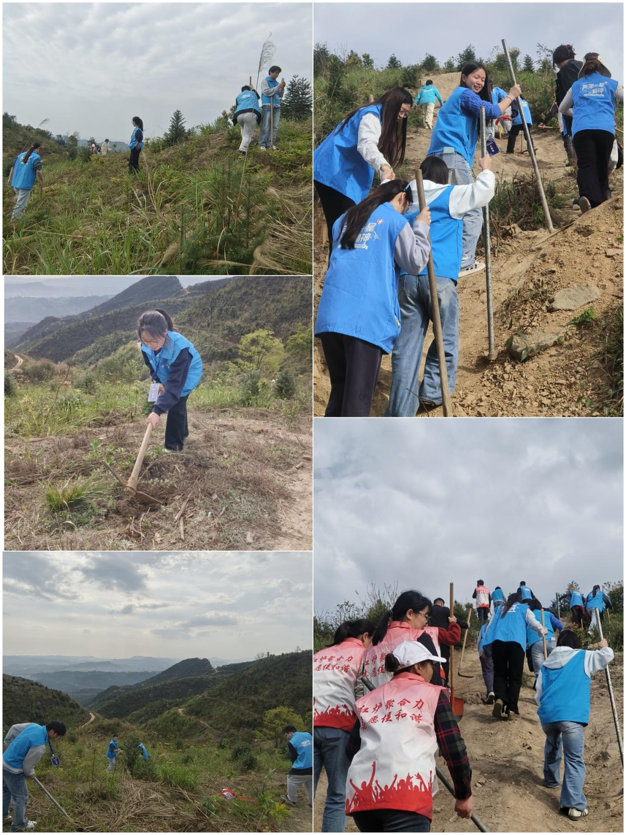 会后,志愿者队伍整装待发,驱车前往铜锣山山顶种植区域。车行山间,春日的山城风光尽收眼底,志愿者们满怀热忱,带着植树工具与嫩绿的木荷苗,奔赴绿意重生的希望之地。