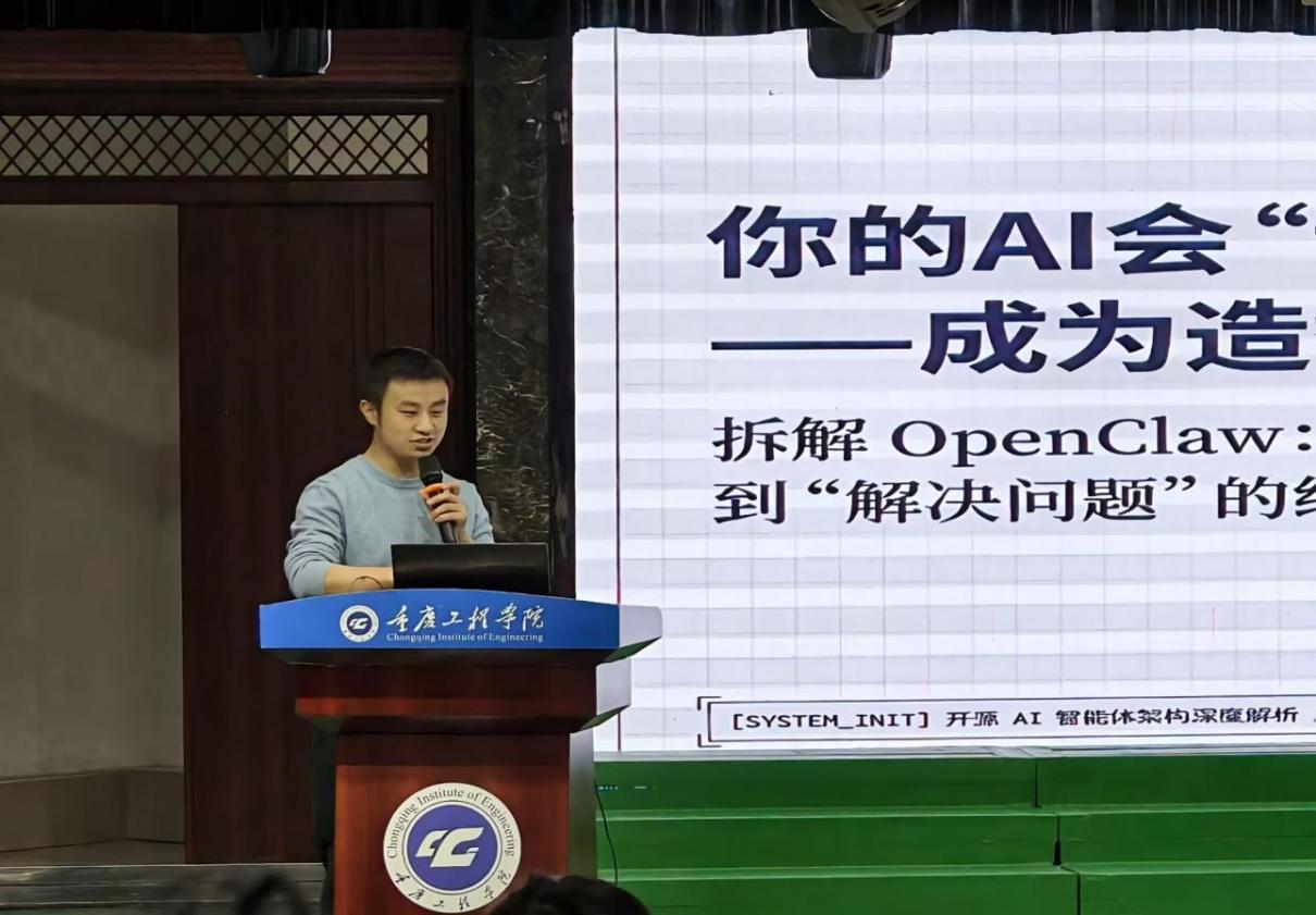 讲座中,慕江林副主任围绕开源AI智能体的发展历程、技术内核、产业应用等话题展开讲解。他以“纯自然语言驱动”下智能体的自主决策与任务执行能力为主题,通过技术拆解与案例演示,介绍了开源AI智能体的核心设计理念、系统初始化逻辑与自然语言驱动的实现原理。通过生动的解析案例与答疑,让在场师生直观体验智能体在复杂场景下的执行能力与应用潜力,感悟AI工具从“信息传递者”向“任务执行者”的变革趋势,提前了解智能体开发、AI 系统架构等新兴岗位的能力要求。