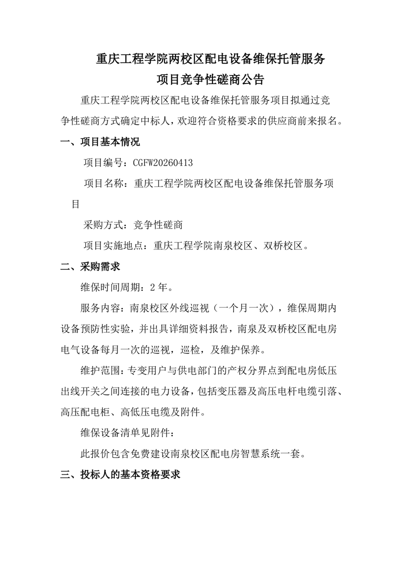 重庆工程学院两校区配电设备维保托管服务项目
