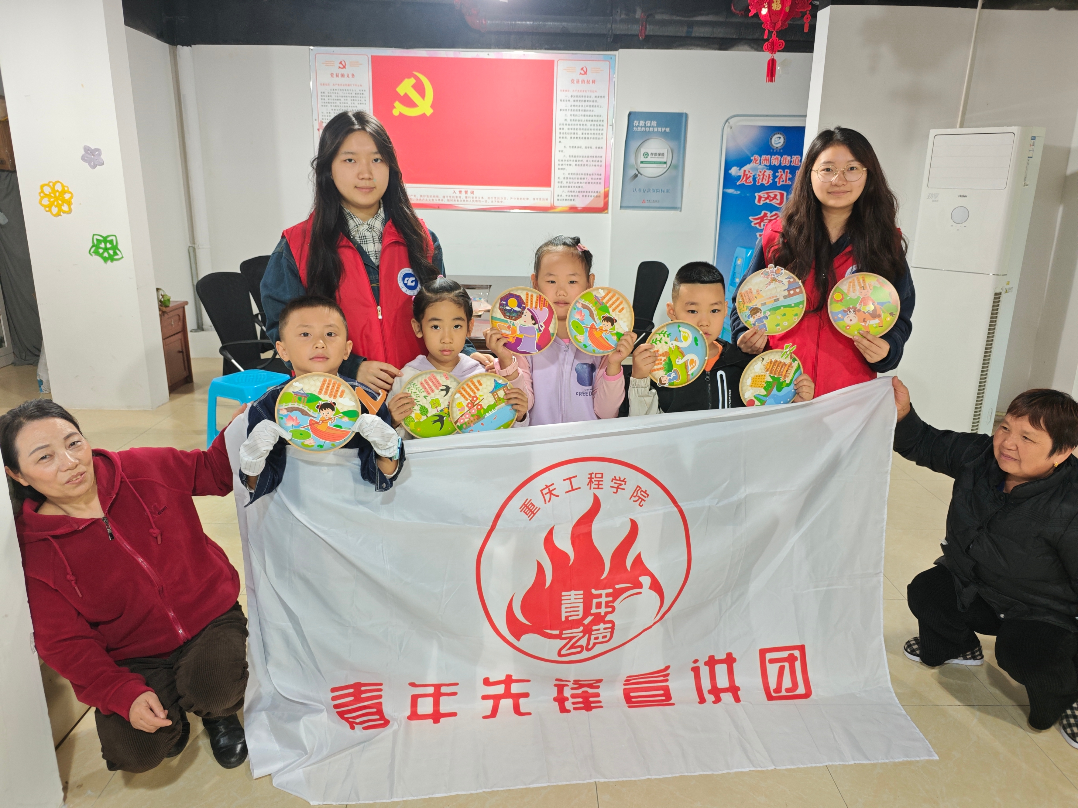 活动伊始,青年先锋宣讲团志愿者们向现场家长与儿童详细介绍了重阳节来源以及登高、赏菊、饮菊花酒、吃重阳糕、佩茱萸等习俗,其核心意义是为了祈福长寿与尊老敬老;然后志愿者们分享了《九月九日忆山东兄弟》等经典重阳节古诗词,为活动营造出浓厚的传统文化氛围。接着,志愿者分发活动材料,引导家长与儿童共同开展古诗词贴画创作,在协作实践中激发大家的动手创造力与审美能力。活动最后,全体人员合影留念,定格下这一充满文化韵味的温馨瞬间。