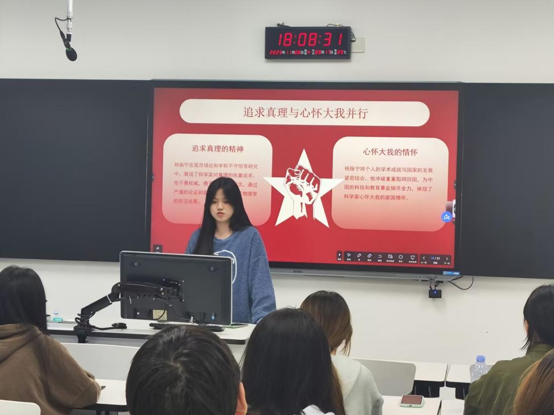 活动以杨振宁先生的科学人生与精神内核为主线,构建了多维度学习场景。宣讲环节中,主讲人既深入解读“杨-米尔斯规范场论”“宇称不守恒”等重大科学成就,剖析其中“追求真理、严谨治学”的求实精神;也讲述杨振宁冲破阻碍归国交流、创建清华高等研究中心、高龄执教等事迹,展现其家国大义。同时,活动还拓展呈现邓稼先隐姓埋名研“两弹”、钱学森归国建航天事业等先辈群像,以群体精神共鸣强化“科学报国”认知。此外,在“听词绘图悟精神”互动环节,主讲人用30个科学报国相关词语,让成员在记忆绘图、抢答中深化对科学符号与人物的印象,让学习更具趣味性。