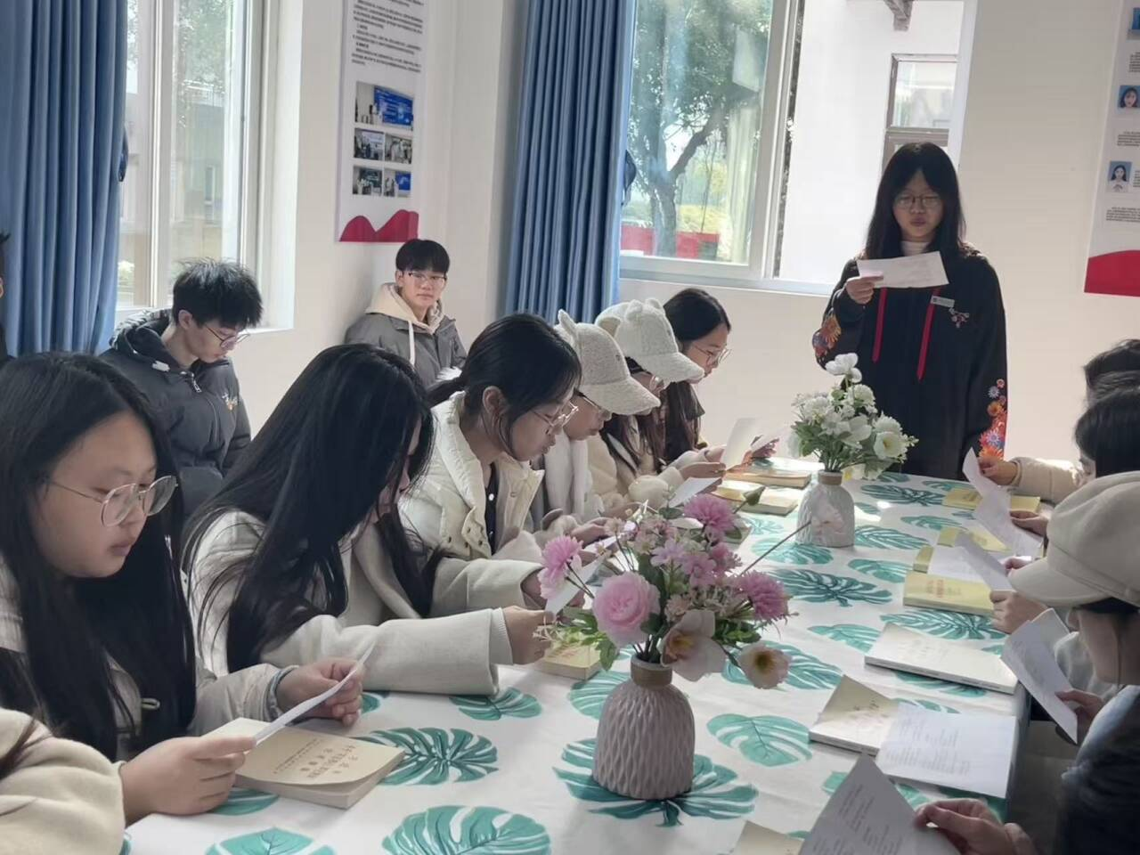 分享会在全体成员集体诵读红色经典篇章中拉开序幕。随后,三位学生代表依次登台,深情讲述了感人至深的红色故事。有的同学以《红岩》中江竹筠烈士的事迹为主线,展现了革命先辈坚定的理想信念;有的分享了“时代楷模”黄文秀在脱贫攻坚一线奉献青春的故事;还有的从家乡红色资源出发,讲述了本地革命先烈的英勇事迹。这些真实而动人的故事,让在场同学深刻感受到中国共产党人的初心使命和奋斗精神。活动最后,主持人对分享会进行总结,强调要将红色精神内化于心、外化于行,把学习成果转化为刻苦钻研、服务社会的实际行动。