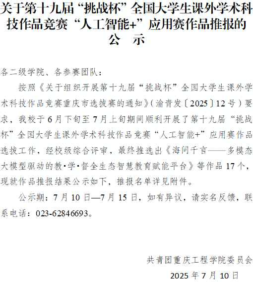 关于第十九届“挑战杯”全国大学生课外学术科技作品竞赛“人工智能+”应用赛作品推报的公示