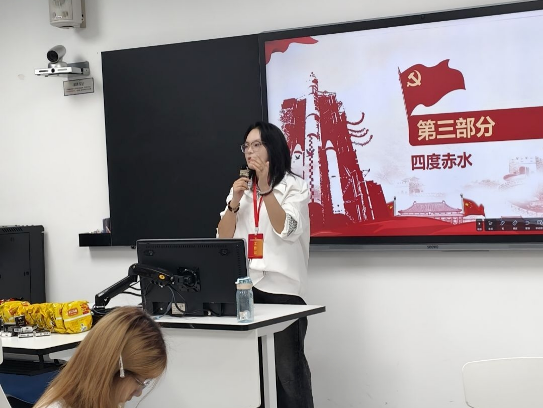 随后,“红色成语版你比我猜”成为团队默契的“试金石”。各队轮流派代表用肢体语言演绎“星星之火”“万众一心”“心向朝阳”等红色成语,其他队员争分夺秒猜测。大家以丰富动作传递信息,配合默契、集思广益,在欢声笑语中提升协作能力,也领会到红色成语蕴含的精神力量。最具挑战性的“四渡赤水”互动游戏紧随其后,桌上八杯满水纸杯的首杯中浮着乒乓球,参赛者需用嘴吹气将球依次传递,球落即重来,以用时最短为胜。队员们凝神屏息控球,队友轻声鼓励,紧张与欢快的气氛感染全场,大家在反复尝试与互助中,切身感受革命先辈不畏艰难、灵活应变、团结奋进的伟大精神。