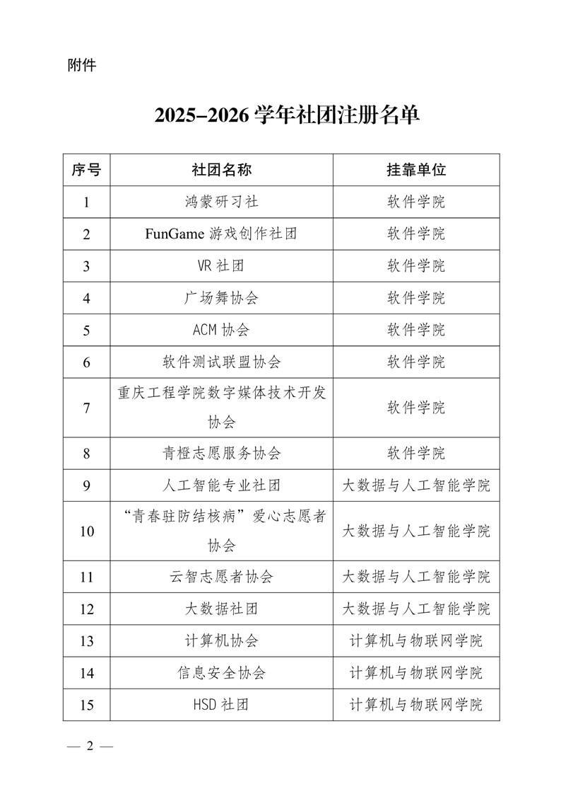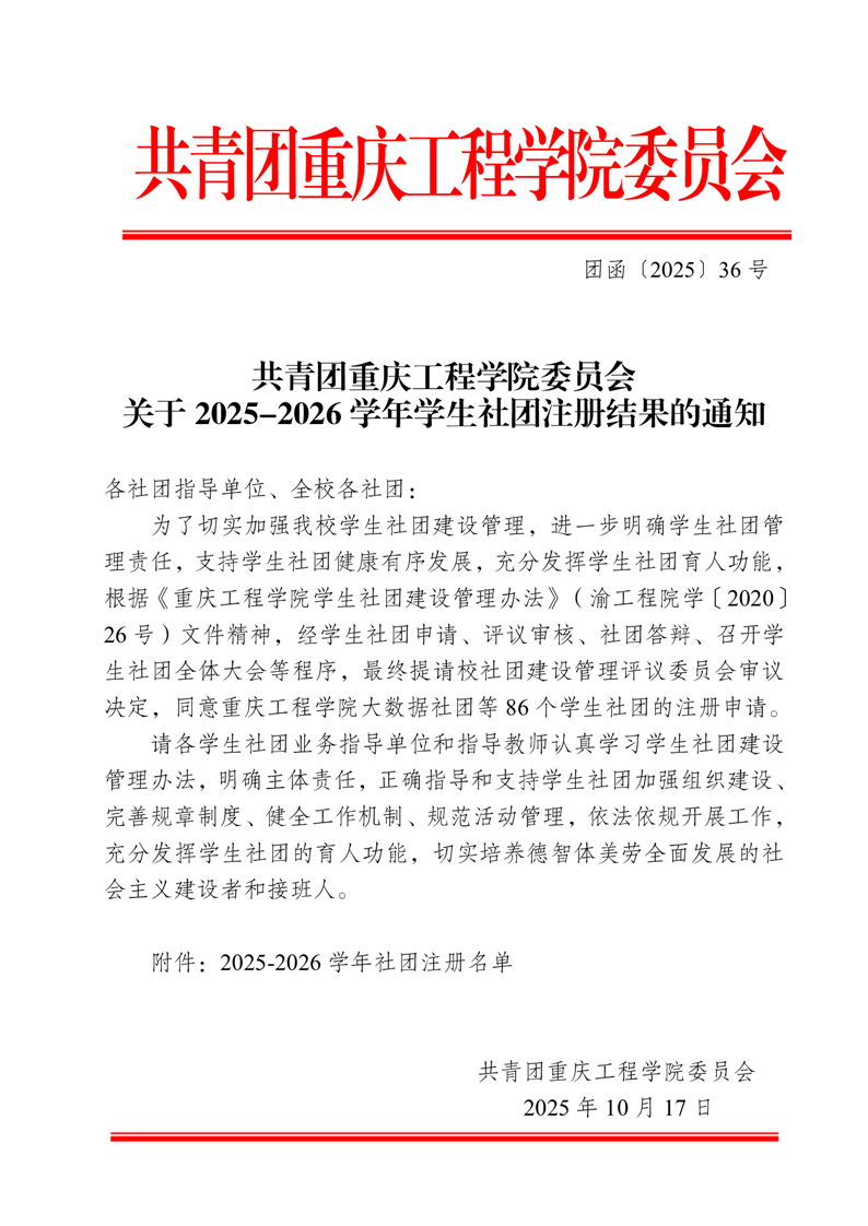 共青团重庆工程学院委员会关于2025-2026学年学生社团注册结果的通知