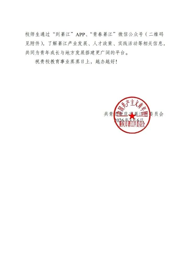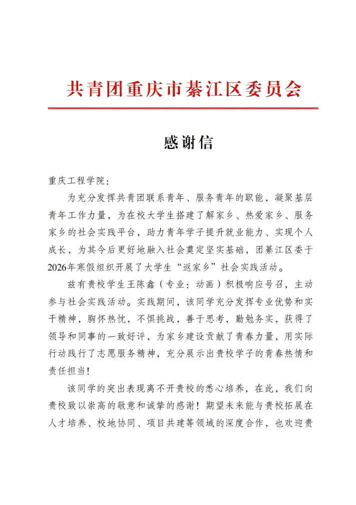 近日,共青团重庆市綦江区委员会向我校发来感谢信,对我校动画专业学子王陈鑫在2026年寒假大学生“返家乡”社会实践活动中的亮眼表现予以高度赞扬,同时对学校的悉心培养表达诚挚谢意。一纸感谢信,是对青春实干的肯定,更是对青年担当的激励。