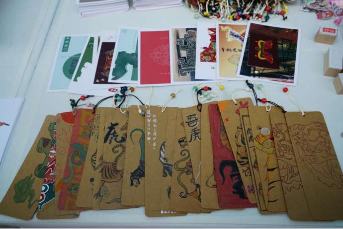 巴渝历史文物展览位前,看到一张张书签上面画着栩栩如生的一些图案,询问后得知是项目组从巴渝地区的土文物和青铜器的文物的图案经过提取出来,精练后再进行加工和创新,赋予古老的巴渝文化新的传播活力。使文物图案中的文化得以保存又更符合现代审美,书签都是由同学们手绘完成。其中有三峡博物馆镇馆之宝青铜鸟尊、偏将军印、虎纽錞于等经典印章,有手绘的书签,还有印着青铜器和巴渝土文物的明信片,看着明信片有种文物在眼前的感觉。