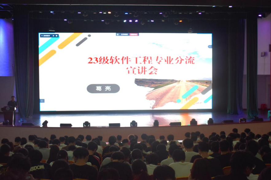 (文/图 软件学院 葛亮) 为了更好地指导23级软件工程专业学生确定专业分流方向,软件工程系在学术报告厅召开软工专业分流宣讲会。软工系副系主任葛亮老师主持会议并作为主讲,学生科及各班班导师配合支持会议工作,23级软件工程专业学生悉数到场参会。
