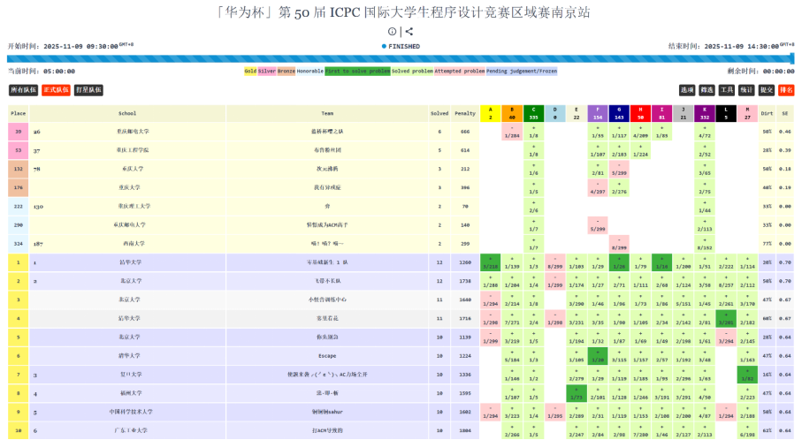 本届赛事云集了包括所有双一流高校(含港澳)在内的335支精英队伍。在与顶尖强队的同台竞技中,我校代表队脱颖而出,取得队伍排名第53、学校排名第37的亮眼成绩,位居重庆市参赛高校第二名。