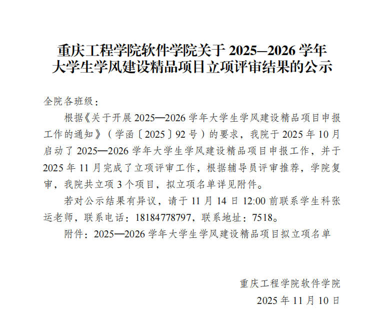 重庆工程学院软件学院关于2025—2026学年大学生学风建设精品项目立项评审结果的公示