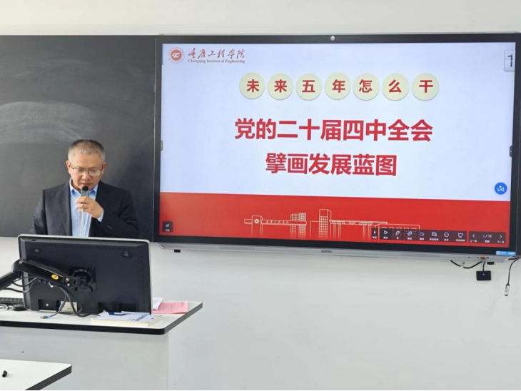 周龙福院长以“党的二十届四中全会擘画发展蓝图—未来五年怎么干”为主题,系统解读党的二十届四中全会公报内容分析了十五五”时期的战略定位,强调这是构筑发展新优势、赢得主动权的关键攻坚期。并详细解读了全会提出的“六个坚持”重大原则和主要目标、具体要求,围绕科技自立自强、现代化产业体系建设等任务,结合学院发展实际引导教职工思考如何将全会精神融入专业建设、人才培养与科研创新。他强调学习贯彻全会精神是当前重要政治任务,老师们要统一思想行动,立足岗位推动学院高质量发展,为基本实现社会主义现代化贡献教育力量。