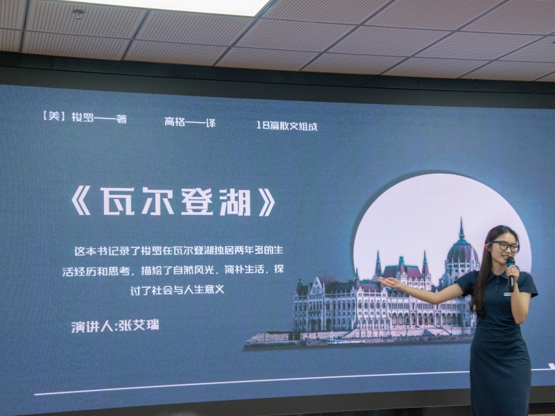 数字艺术学院张艾瑞同学通过推荐梭罗的《瓦尔登湖》,诠释了焦虑的源头与减压的方式,激励大家学会珍惜当下的美好和温暖,学会与自然和谐共处,学会在忙碌的生活中寻找片刻的宁静。参赛选手们从多个维度解析好书推荐的价值点,将阅读转化为富有感染力的语言表达。