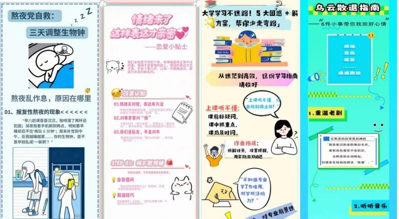 “暖心贴士”海报创作比赛聚焦大学生在学习、生活、就业等方面的心理困惑,共征集233组作品,337名学生参与。最终28名学生获奖。该比赛激发了学生的创新思维,并提升了他们对心理成长问题的认识与解决能力。