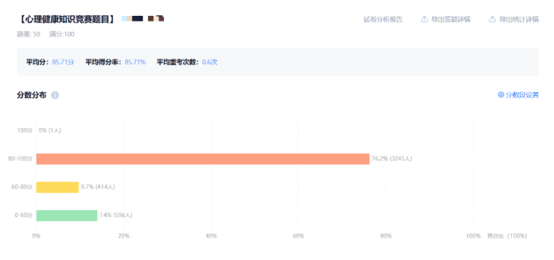 心理健康线上知识竞赛题型涵盖单选、多选和判断,内容涉及心理健康知识、校内资源及心理疾病常识等,满分100分。活动共吸引4255人关注,3699人参与答题,其中1712人得分达到89分及以上,有效夯实了学生的心理健康知识基础。