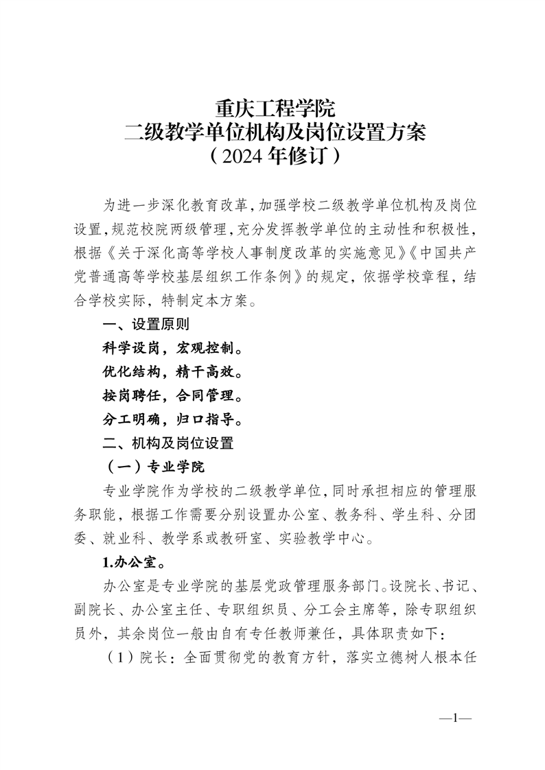 重庆工程学院二级教学单位机构及岗位设置方案(2024年修订)