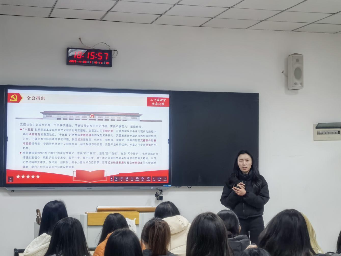 活动中,思政课教师罗丽娜围绕二十届四中全会的重大意义、核心要义与实践要求进行了系统梳理和深入浅出的讲解,引导学生深刻领会党中央关于推进国家治理体系和治理能力现代化的战略部署,鼓励大家将个人成长融入国家发展大局,坚定理想信念,提升综合素养。