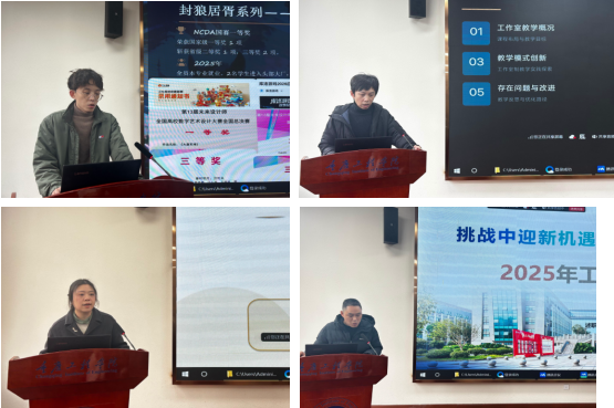 会议分为集中述职与分系述职两个阶段。第一阶段中,学院各中心负责人、系主任及系副主任依次登台,围绕2025年度教学科研、学科建设、产教融合等核心任务,以数据化、案例化的方式总结成效、剖析不足,并提出改进方向,汇报内容精炼、重点突出。